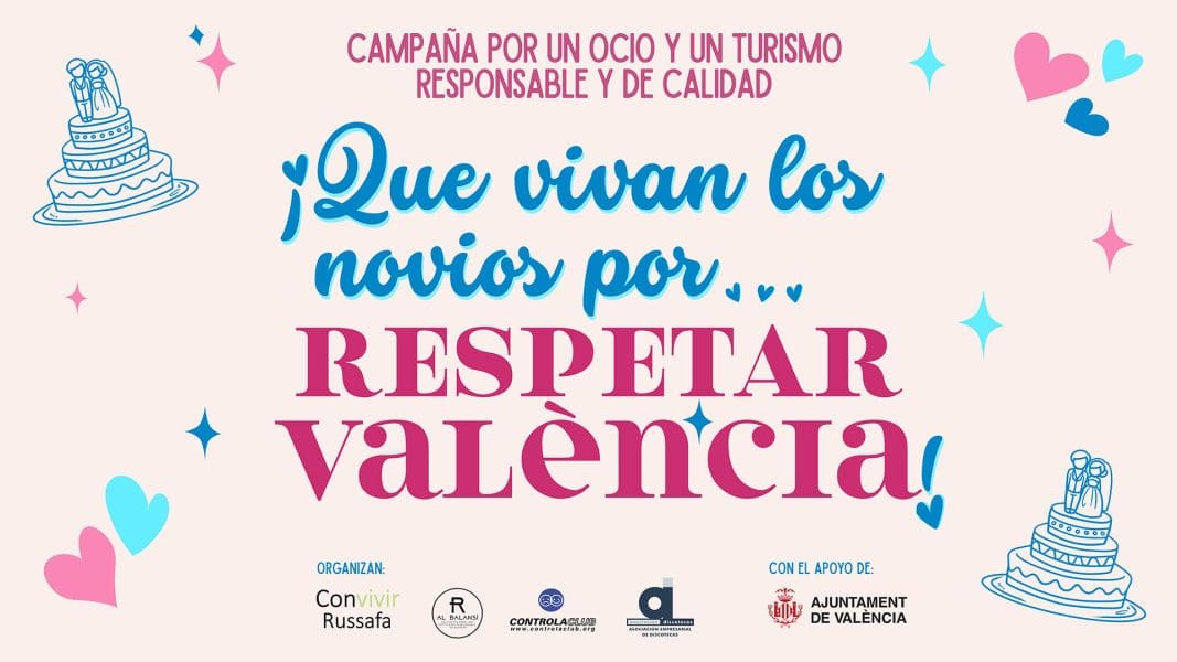 El Ayuntamiento de València, a través de la Concejalía de Turismo y con la colaboración de la plataforma Convivir Russafa, la Coordinadora de hostelería de los barrios de València, la Asociación empresarial de discotecas de València y la plataforma 014 Media, ha puesto en marcha una nueva edición de la campaña ‘Que vivan los novios por respetar València’.